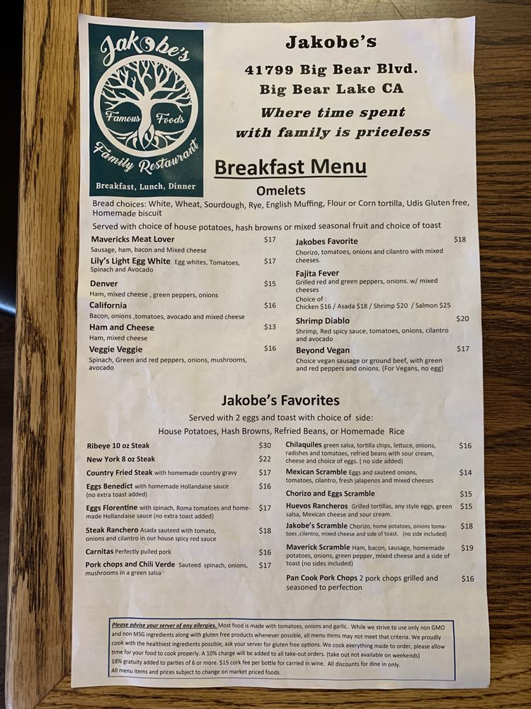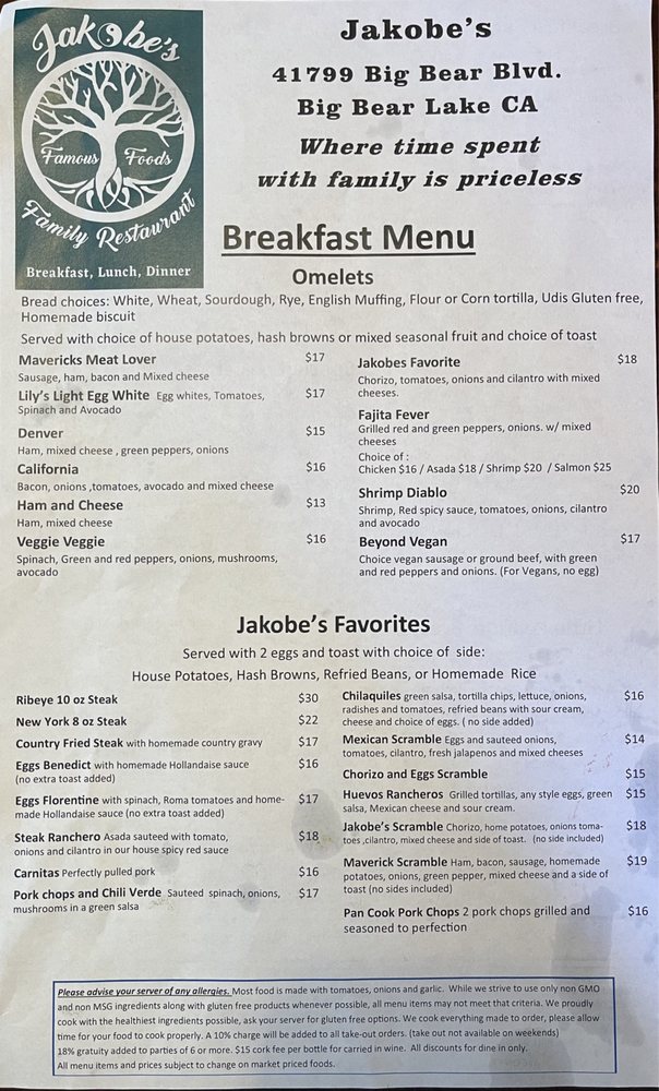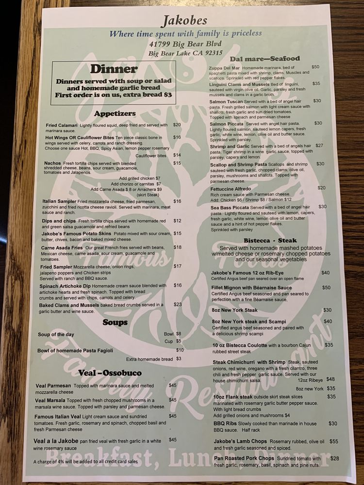 Welcome to Jakobe's Famous Foods, a delightful blend of Italian-American cuisine located in the picturesque setting of Big Bear Lake, CA. This charming eatery is renowned for its hearty, flavorful dishes that cater to all palates. The menu features delectable Italian favorites like Fettuccine Alfredo with Spicy Shrimp, rich in creamy texture and taste, as well as Lobster Ravioli, tantalizingly served with a special lobster cream sauce.